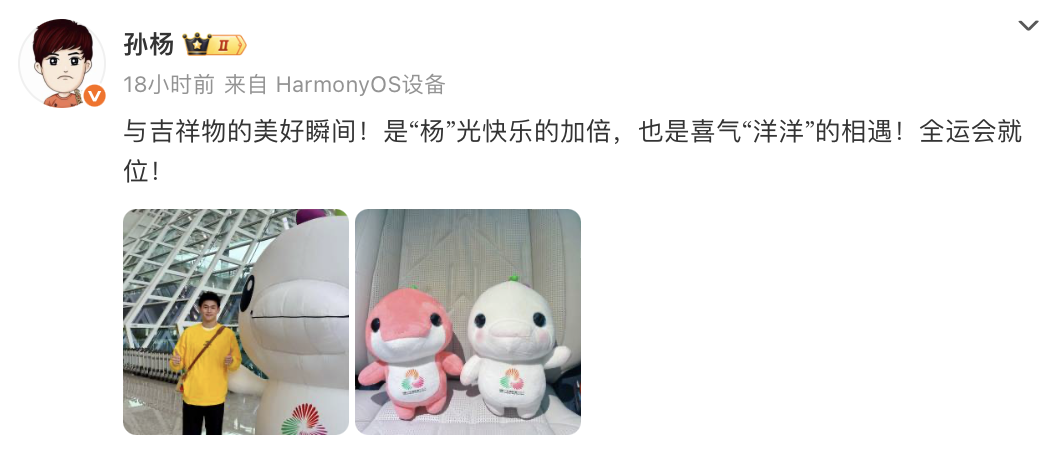 11月7日下昼,孙杨在外交平台发文,称“全运会已就位”,还晒出和祯祥物的合照。