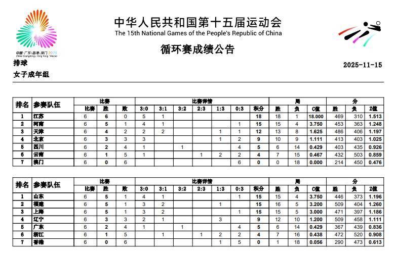 新华社澳门11月15日电(记者王人菲、胡好意思人)第十五届全运会排球女子成年组小组赛15日收官,北京队、辽宁队当日均以3:0投降敌手,隔离拿到小组终末一张八强入场券。