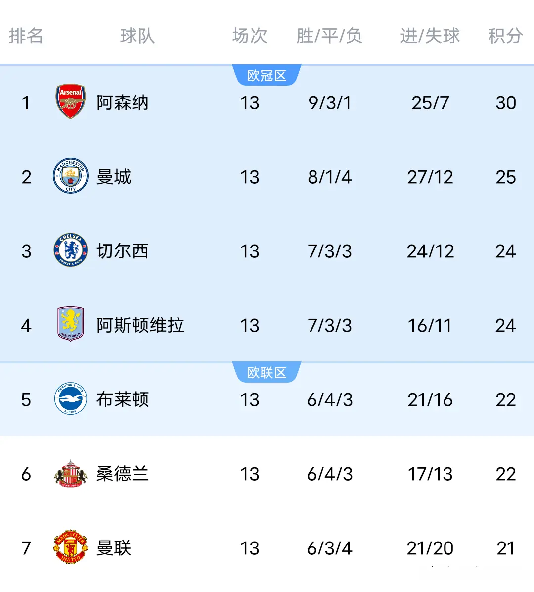 北京技术12月1日,英超联赛第13轮的比赛开打,在最新实现的三场比赛中,长技术10东谈主作战切尔西1-1打平领头羊阿森纳,利物浦触底反弹2-0零封西汉姆,曼联2-1力擒水晶宫,这么一来最新的积分榜还是更新,阿森纳连续领跑5分上风,曼城稳居第二体育集锦,切尔西第三,维拉第四!
