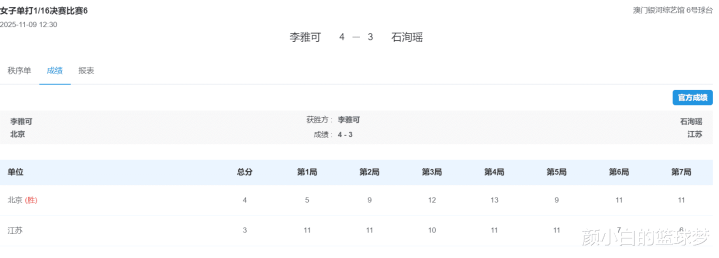 北京时期11月9日,全运会女单1/16决赛,北京队的李雅可4-3逆转江苏队的石洵瑶,七局比分:5-11,9-11,12-10,13-11,9-11,11-7,11-6。也即是说李雅可在大比分0-2过期的情况下扳成2-2,天王山照旧李雅可拿到3-2反超,石洵瑶拿劣等六局干涉抢七,最终抢七石洵瑶崩盘。