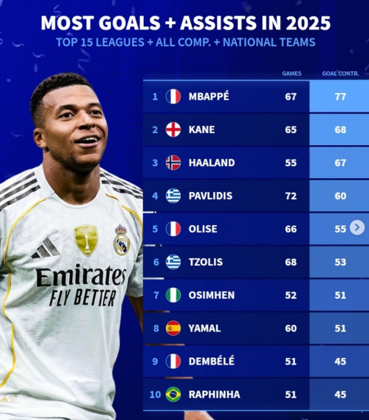 直播吧1月2日讯2025年依然由去,《转会市集》也统计了2025前15联赛球员的俱乐部+国度队各项赛事总参与进球情况,皇马前卫姆巴佩领跑。